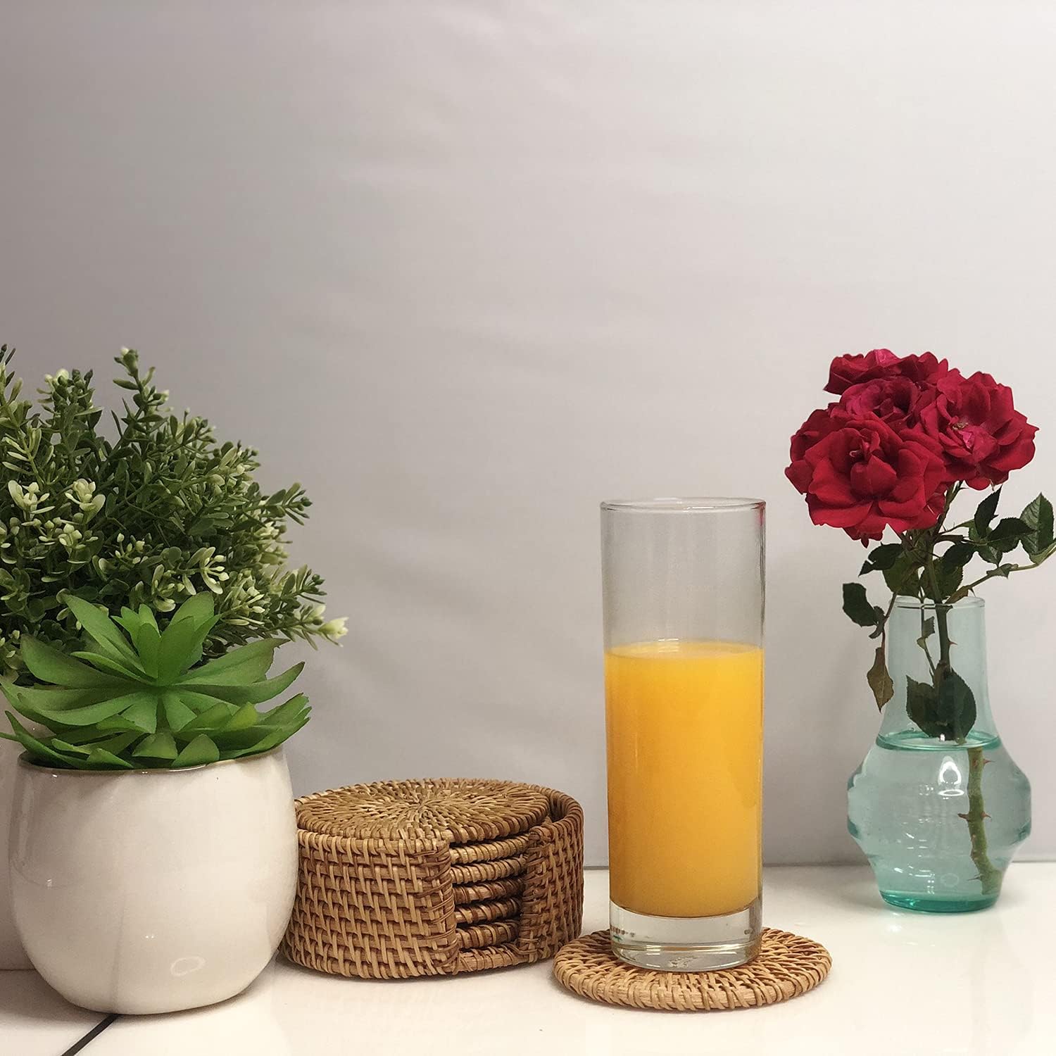 Handmade Boho Rattan Drink Coasters Set of 6 with Holder, Heat-Resistant Wicker Woven Table Coasters